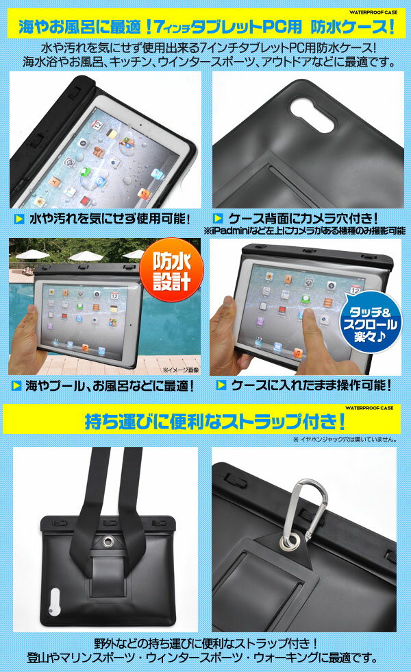 防水加工の7インチタブレットPC用ケース(全4色)ストラップ付き/海水浴やお風呂に便利!ケースにいれたまま操作可能!Nexus 7、GALAXY Tab、 Kindle Fire HD、iPad miniなどに幅広く対応 タブレットPCケース