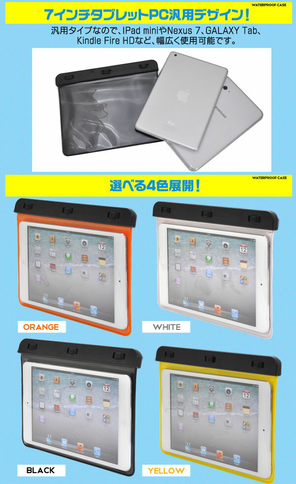■防水加工の7インチタブレットPC用ケース! 海水浴やお風呂に便利な、7インチタブレットPC用防水カラーケース! ■幅広い7インチタブレットPCで使用可能! 汎用タイプなので、Nexus 7、GALAXY Tab、 Kindle Fire HDなど、幅広く使用可能!少し大きめなiPad miniにも使用できます! ■静止画・動画の撮影可能! 裏面の左上に透明のカメラ窓がついているので、雨や水・砂の浸入を恐れず、海やプールで静止画・動画を撮影可能!! ※左上にカメラがある機種のみ。
